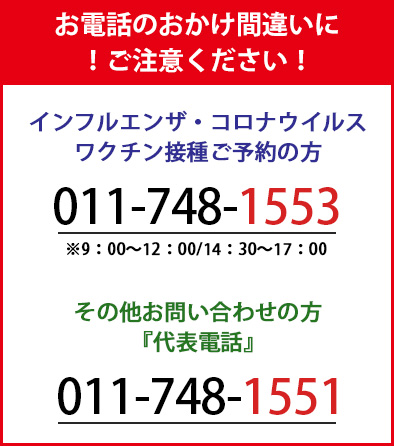 予約方法 | 予約専用電話番号 011-748-1553 予約受付時間 9:00~12:00 / 14:30~17:00 ※木曜、土曜は午後不可 ※休診日・時間外のお電話はご対応できません。 |